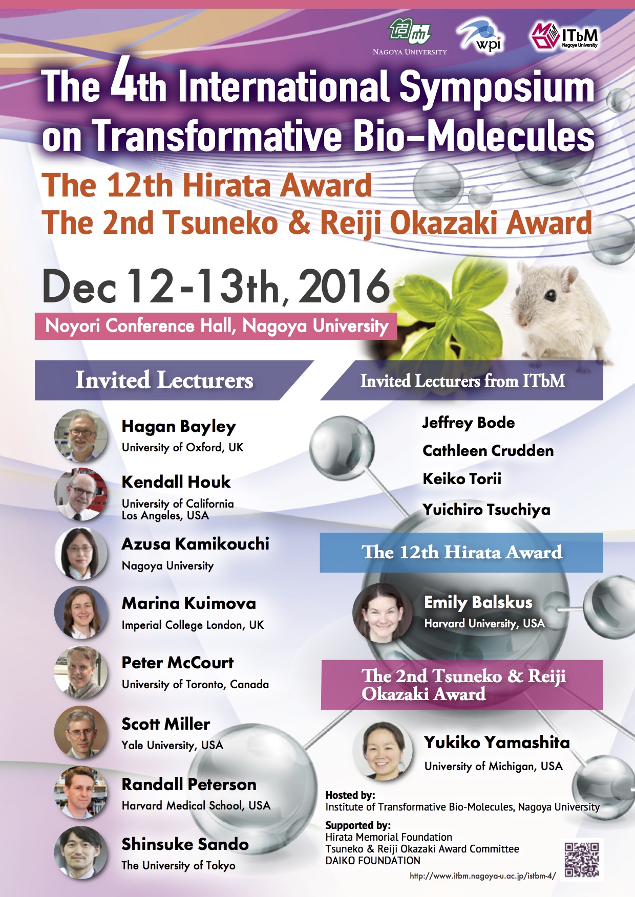 世界トップレベル研究拠点・名古屋大学トランスフォーマティブ生命分子研究所(WPI-ITbM)が第4回の国際シンポジウムを開催します。今回も、世界で活躍する有機合成化学者、動植物生物学者をお呼びし、最先端の研究成果をご講演いただきます。 招待講演者は以下の通りです(敬称略・アルファベット順)。 Hagan Bayley (University of Oxford, UK), Kendall Houk (University of California Los Angeles, USA), Azusa Kamikouchi (Nagoya University), Marina Kuimova (Imperial College London, UK), Peter McCourt (University of Toronto, Canada), Scott Miller (Yale University, USA), Randall Peterson (Harvard Medical School, USA), Shinsuke Sando (The University of Tokyo), Jeffrey Bode (ITbM; ETH-Zürich, Switzerland), Cathleen Crudden (ITbM; Queens University, Canada), Keiko Torii (ITbM; Univ. of Washington; HHMI, USA), Yuichiro Tsuchiya (ITbM) また、世界で活躍する若手の有機化学者および生物学者を表彰する第12回平田アワードおよび第2回岡崎令治・恒子賞も同時に開催いたします。- シンポジウムポスター (PDF File)
